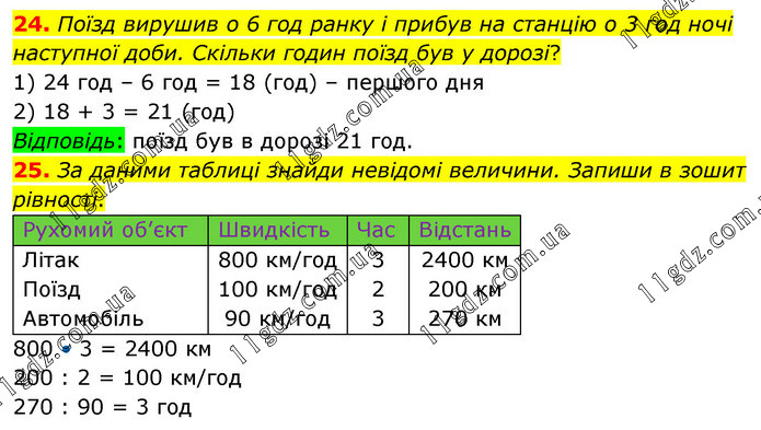 Поїзд вирушив о 6 год ранку і прибув на станцію о 3 год ночі наступної доби. Скільки годин поїзд був у дорозі? 1) 24 год – 6 год = 18 (год) – першого дня 2) 18 + 3 = 21 (год) Відповідь: поїзд був в дорозі 21 год. 25. За даними таблиці знайди невідомі величини. Запиши в зошит рівності. 800 • 3 = 2400 км 200 : 2 = 100 км/год 270 : 90 = 3 год