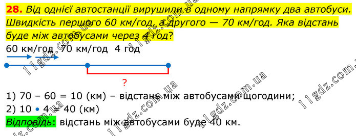 Від однієї автостанції вирушили в одному напрямку два автобуси. Швидкість першого 60 км/год, а другого — 70 км/год. Яка відстань буде між автобусами через 4 год? 1) 70 – 60 = 10 (км) – відстань між автобусами щогодини; 2) 10 • 4 = 40 (км) Відповідь: відстань між автобусами буде 40 км.