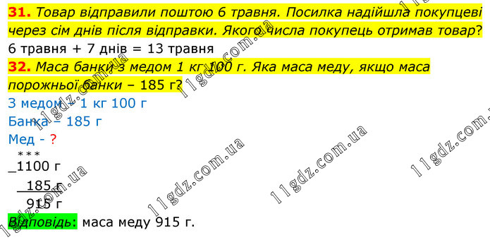 Товар відправили поштою 6 травня. Посилка надійшла покупцеві через сім днів після відправки. Якого числа покупець отримав товар? 6 травня + 7 днів = 13 травня 32. Маса банки з медом 1 кг 100 г. Яка маса меду, якщо маса порожньої банки – 185 г? З медом – 1 кг 100 г Банка – 185 г Мед - ? Відповідь: маса меду 915 г.