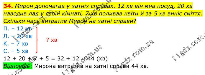 Мирон допомагав у хатніх справах. 12 хв він мив посуд, 20 хв наводив лад у своїй кімнаті, 7 хв поливав квіти й за 5 хв виніс сміття. Скільки часу витратив Мирон на хатні справи? 12 + 20 + 7 + 5 = 32 + 12 = 44 (хв) Відповідь: Мирона витратив на хатні справи 44 хв.