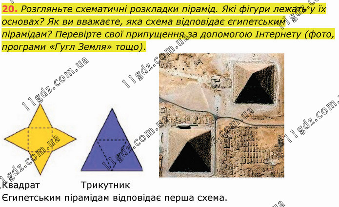 Розгляньте схематичні розкладки пірамід. Які фігури лежать у їх основах? Як ви вважаєте, яка схема відповідає єгипетським пірамідам? Перевірте свої припущення за допомогою Інтернету (фото, програми «Гугл Земля» тощо).