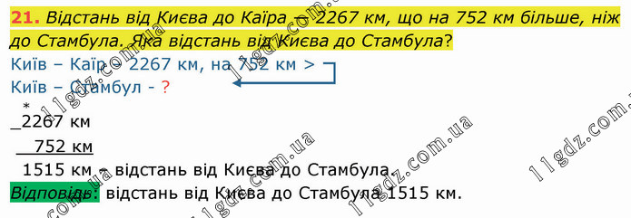 Відстань від Києва до Каїра — 2267 км, що на 752 км більше, ніж до Стамбула. Яка відстань від Києва до Стамбула? Київ – Каїр – 2267 км, на 752 км > Київ – Стамбул - ? Відповідь: відстань від Києва до Стамбула 1515 км.