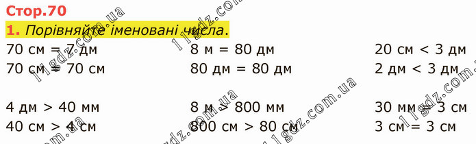 Порівняйте іменовані числа. 70 см = 7 дм 70 см = 70 см 4 дм > 40 мм 40 см > 4 см 8 м = 80 дм 80 дм = 80 дм 8 м > 800 мм 800 см > 80 см 20 см < 3 дм 2 дм < 3 дм 30 мм = 3 см 3 см = 3 см
