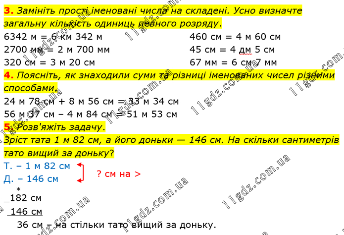 Замініть прості іменовані числа на складені. Усно визначте загальну кількість одиниць певного розряду. 6342 м = 6 км 342 м 2700 мм = 2 м 700 мм 320 см = 3 м 20 см 460 см = 4 м 60 см 45 см = 4 дм 5 см 67 мм = 6 см 7 мм 4. Поясніть, як знаходили суми та різниці іменованих чисел різними способами. 24 м 78 см + 8 м 56 см = 33 м 34 см 56 м 37 см – 4 м 84 см = 51 м 53 см 5. Розв'яжіть задачу. Зріст тата 1 м 82 см, а його доньки — 146 см. На скільки сантиметрів тато вищий за доньку? 182 см - 146 см = 36 см – на стільки тато вищий за доньку.