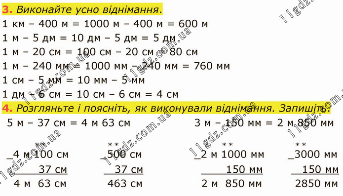 Виконайте усно віднімання. 1 км – 400 м = 1000 м – 400 м = 600 м 1 м – 5 дм = 10 дм – 5 дм = 5 дм 1 м – 20 см = 100 см – 20 см = 80 см 1 м – 240 мм = 1000 мм – 240 мм = 760 мм 1 см – 5 мм = 10 мм – 5 мм 1 дм – 6 см = 10 см – 6 см = 4 см 4. Розгляньте і поясніть, як виконували віднімання. Запишіть. 5 м – 37 см = 4 м 63 см 3 м – 150 мм = 2 м 850 мм