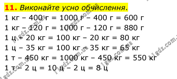 Виконайте усно обчислення. 1 кг – 400 г = 1000 г – 400 г = 600 г 1 кг – 120 г = 1000 г – 120 г = 880 г 1 ц – 20 кг = 100 кг – 20 кг = 80 кг 1 ц – 35 кг = 100 кг – 35 кг = 65 кг 1 т – 450 кг = 1000 кг – 450 кг = 550 кг 1 т – 2 ц = 10 ц – 2 ц = 8 ц