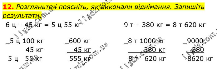 Розгляньте і поясніть, як виконали віднімання. Запишіть результати. 6 ц – 45 кг = 5 ц 55 кг 9 т – 380 кг = 8 т 620 кг