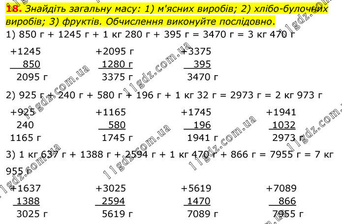 Знайдіть загальну масу: 1) м'ясних виробів; 2) хлібо-булочних виробів; 3) фруктів. Обчислення виконуйте послідовно. 1) 850 г + 1245 г + 1 кг 280 г + 395 г = 3470 г = 3 кг 470 г 2) 925 г + 240 г + 580 г + 196 г + 1 кг 32 г = 2973 г = 2 кг 973 г 3) 1 кг 637 г + 1388 г + 2594 г + 1 кг 470 г + 866 г = 7955 г = 7 кг 955 г