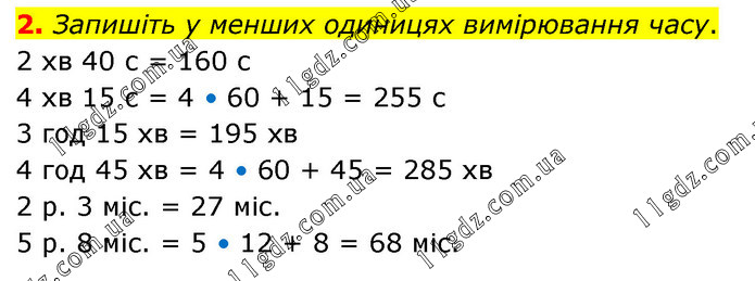 Запишіть у менших одиницях вимірювання часу. 2 хв 40 с = 160 с 4 хв 15 с = 4 • 60 + 15 = 255 с 3 год 15 хв = 195 хв 4 год 45 хв = 4 • 60 + 45 = 285 хв 2 р. 3 міс. = 27 міс. 5 р. 8 міс. = 5 • 12 + 8 = 68 міс.
