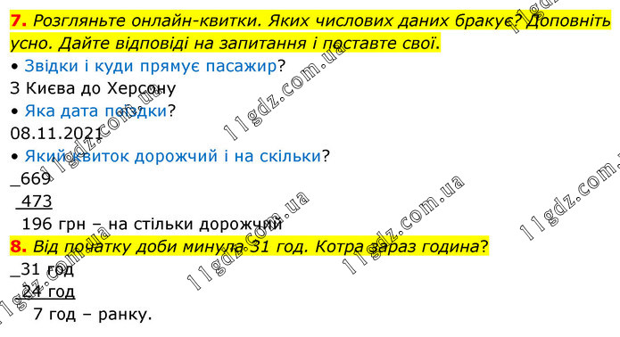 Розгляньте онлайн-квитки. Яких числових даних бракує? Доповніть усно. Дайте відповіді на запитання і поставте свої. • Звідки і куди прямує пасажир? З Києва до Херсону • Яка дата поїздки? 08.11.2021 • Який квиток дорожчий і на скільки? 8. Від початку доби минула 31 год. Котра зараз година?
