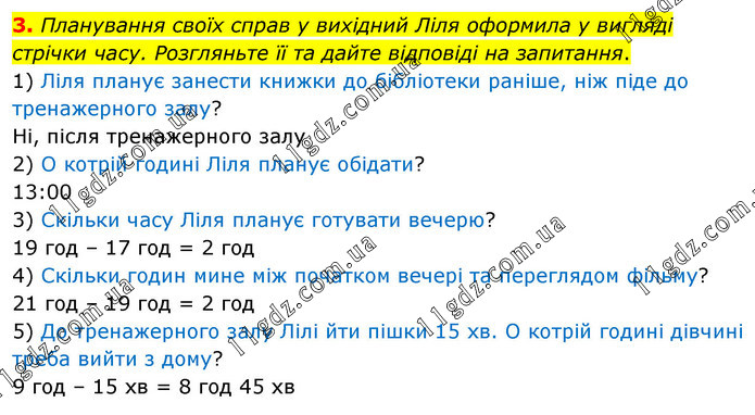 Планування своїх справ у вихідний Ліля оформила у вигляді стрічки часу. Розгляньте її та дайте відповіді на запитання. 1) Ліля планує занести книжки до бібліотеки раніше, ніж піде до тренажерного залу? Ні, після тренажерного залу 2) О котрій годині Ліля планує обідати? 13:00 3) Скільки часу Ліля планує готувати вечерю? 19 год – 17 год = 2 год 4) Скільки годин мине між початком вечері та переглядом фільму? 21 год – 19 год = 2 год 5) До тренажерного залу Лілі йти пішки 15 хв. О котрій годині дівчині треба вийти з дому? 9 год – 15 хв = 8 год 45 хв