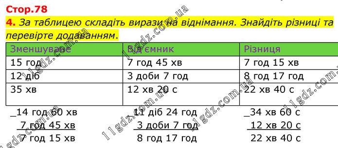 За таблицею складіть вирази на віднімання. Знайдіть різниці та перевірте додаванням.