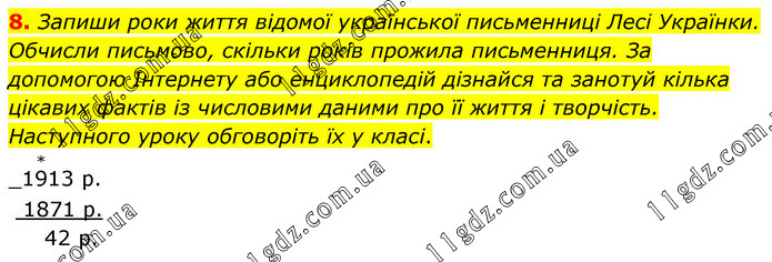Запиши роки життя відомої української письменниці Лесі Українки. Обчисли письмово, скільки років прожила письменниця. За допомогою Інтернету або енциклопедій дізнайся та занотуй кілька цікавих фактів із числовими даними про її життя і творчість. Наступного уроку обговоріть їх у класі.