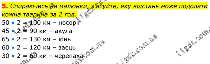 Спираючись на малюнки, з'ясуйте, яку відстань може подолати кожна тварина за 2 год. 50 • 2 = 100 км – носоріг 45 • 2 = 90 км – акула 65 • 2 = 130 км – кінь 60 • 2 = 120 км – заєць 30 • 2 = 60 км – черепаха