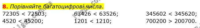 Порівняйте багатоцифрові числа. 72305 < 72503; 4520 < 45200; 63426 < 63526; 1201 < 1210; 345602 < 345620; 700200 > 200700.