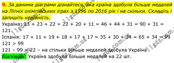 За даними діаграми дізнайтеся, яка країна здобула більше медалей на Літніх олімпійських іграх з 1996 по 2016 рік і на скільки. Складіть і запишіть нерівність. Україна: 23 + 23 + 22 + 22 + 20 + 11 = 46 + 44 + 31 = 90 + 31 = 121 Іспанія: 17 + 11 + 19 + 18 + 17 + 17 = 35 + 30 + 34 = 65 + 34 = 99 121 > 99 121 – 99 = 22 – на стільки більше медалей здобула Україна Відповідь: Україна здобула більше медалей на 22 шт.