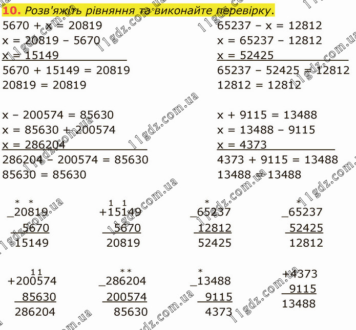 Розв'яжіть рівняння та виконайте перевірку. 5670 + х = 20819 х = 20819 – 5670 х = 15149__________ 5670 + 15149 = 20819 20819 = 20819 65237 – х = 12812 х = 65237 – 12812 х = 52425___________ 65237 – 52425 = 12812 12812 = 12812 х – 200574 = 85630 х = 85630 + 200574 х = 286204____________ 286204 – 200574 = 85630 85630 = 85630 х + 9115 = 13488 х = 13488 – 9115 х = 4373__________ 4373 + 9115 = 13488 13488 = 13488