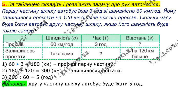 За таблицею складіть і розв'яжіть задачу про рух автомобіля. Першу частину шляху автобус їхав 3 год зі швидкістю 60 км/год. Йому залишилося проїхати на 120 км більше ніж він проїхав. Скільки часу буде їхати автобус другу частину шляху, якщо його швидкість буде такою самою? 1) 60 • 3 = 180 (км) – проїхав перчу частину; 2) 180 + 120 = 300 (км) – залишилося проїхати; 3) 300 : 60 = 5 (год) Відповідь: другу частину шляху автобус буде їхати 5 год.
