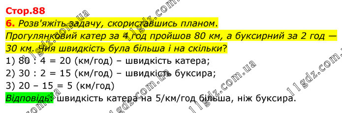 Розв'яжіть задачу, скориставшись планом. Прогулянковий катер за 4 год пройшов 80 км, а буксирний за 2 год — 30 км. Чия швидкість була більша і на скільки? 1) 80 : 4 = 20 (км/год) – швидкість катера; 2) 30 : 2 = 15 (км/год) – швидкість буксира; 3) 20 – 15 = 5 (км/год) Відповідь: швидкість катера на 5/км/год більша, ніж буксира