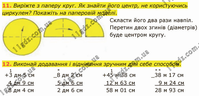 Виріжте з паперу круг. Як знайти його центр, не користуючись циркулем? Покажіть на паперовій моделі. Скласти його два рази навпіл. Перетин двох згинів (діаметрів) буде центром кругу.