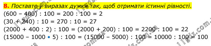 Поставте у виразах дужки так, щоб отримати істинні рівності. (600 – 400) : 100 = 200 : 100 = 2 (30 + 240) : 10 = 270 : 10 = 27 (2000 + 400 : 2) : 100 = (2000 + 200) : 100 = 2200 : 100 = 22 (15000 – 1000 • 5) : 100 = (15000 – 5000) : 100 = 10000 : 100 = 100