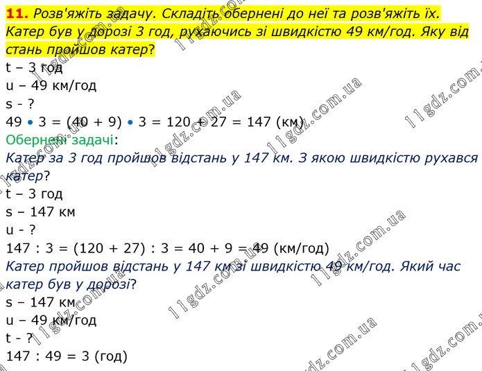Розв'яжіть задачу. Складіть обернені до неї та розв'яжіть їх. Катер був у дорозі 3 год, рухаючись зі швидкістю 49 км/год. Яку від стань пройшов катер? t – 3 год u – 49 км/год s - ? 49 • 3 = (40 + 9) • 3 = 120 + 27 = 147 (км) Обернені задачі: Катер за 3 год пройшов відстань у 147 км. З якою швидкістю рухався катер? t – 3 год s – 147 км u - ? 147 : 3 = (120 + 27) : 3 = 40 + 9 = 49 (км/год) Катер пройшов відстань у 147 км зі швидкістю 49 км/год. Який час катер був у дорозі? s – 147 км u – 49 км/год t - ? 147 : 49 = 3 (год)