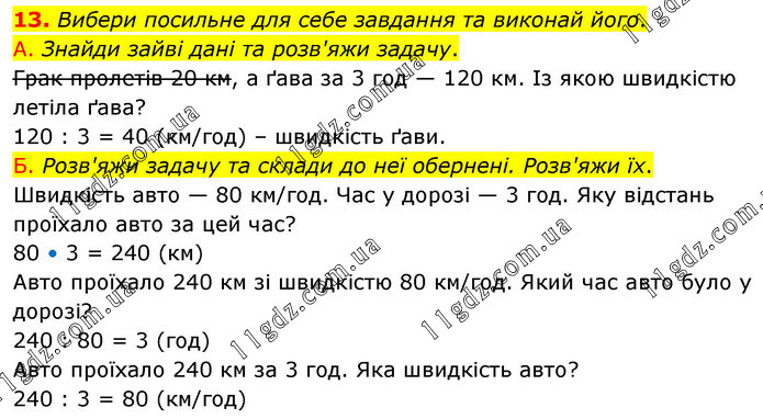 Вибери посильне для себе завдання та виконай його. А. Знайди зайві дані та розв'яжи задачу. Грак пролетів 20 км, а ґава за 3 год — 120 км. Із якою швидкістю летіла ґава? 120 : 3 = 40 (км/год) – швидкість ґави. Б. Розв'яжи задачу та склади до неї обернені. Розв'яжи їх. Швидкість авто — 80 км/год. Час у дорозі — 3 год. Яку відстань проїхало авто за цей час? 80 • 3 = 240 (км) Авто проїхало 240 км зі швидкістю 80 км/год. Який час авто було у дорозі? 240 : 80 = 3 (год) Авто проїхало 240 км за 3 год. Яка швидкість авто? 240 : 3 = 80 (км/год)