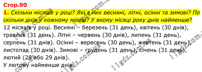 Скільки місяців у році? Які з них весняні, літні, осінні та зимові? По скільки днів у кожному місяці? У якому місяці року днів найменше? 12 місяців у році. Весняні – березень (31 день), квітень (30 днів), травень (31 день). Літні – червень (30 днів), липень (31 день), серпень (31 днів). Осінні – вересень (30 день), жовтень (31 день), листопад (30 днів). Зимові – грудень (31 день), січень (31 день), лютий (28 або 29 днів). У лютому найменше днів.