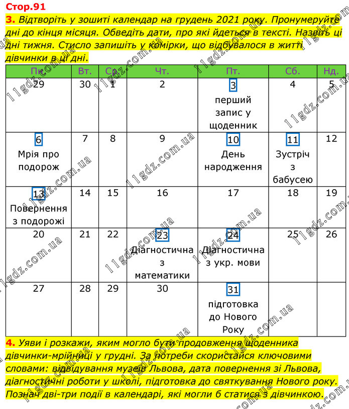 Відтворіть у зошиті календар на грудень 2021 року. Пронумеруйте дні до кінця місяця. Обведіть дати, про які йдеться в тексті. Назвіть ці дні тижня. Стисло запишіть у комірки, що відбувалося в житті дівчинки в ці дні. 4. Уяви і розкажи, яким могло бути продовження щоденника дівчинки-мрійниці у грудні. За потреби скористайся ключовими словами: відвідування музеїв Львова, дата повернення зі Львова, діагностичні роботи у школі, підготовка до святкування Нового року. Познач дві-три події в календарі, які могли б статися з дівчинкою.
