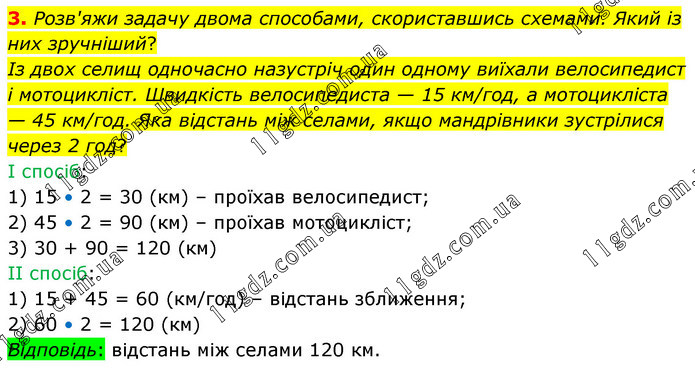 Розв'яжи задачу двома способами, скориставшись схемами. Який із них зручніший? Із двох селищ одночасно назустріч один одному виїхали велосипедист і мотоцикліст. Швидкість велосипедиста — 15 км/год, а мотоцикліста — 45 км/год. Яка відстань між селами, якщо мандрівники зустрілися через 2 год? І спосіб: 1) 15 • 2 = 30 (км) – проїхав велосипедист; 2) 45 • 2 = 90 (км) – проїхав мотоцикліст; 3) 30 + 90 = 120 (км) ІІ спосіб: 1) 15 + 45 = 60 (км/год) – відстань зближення; 2) 60 • 2 = 120 (км) Відповідь: відстань між селами 120 км.