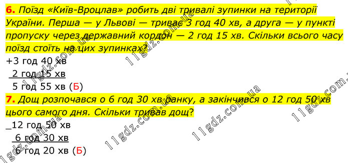Поїзд «Київ-Вроцлав» робить дві тривалі зупинки на території України. Перша — у Львові — триває 3 год 40 хв, а друга — у пункті пропуску через державний кордон — 2 год 15 хв. Скільки всього часу поїзд стоїть на цих зупинках? Дощ розпочався о 6 год 30 хв ранку, а закінчився о 12 год 50 хв цього самого дня. Скільки тривав дощ?
