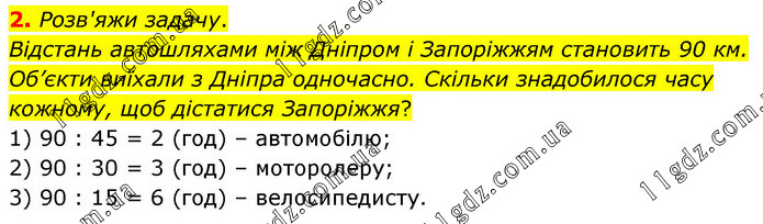 Розв'яжи задачу. Відстань автошляхами між Дніпром і Запоріжжям становить 90 км. Об’єкти виїхали з Дніпра одночасно. Скільки знадобилося часу кожному, щоб дістатися Запоріжжя? 1) 90 : 45 = 2 (год) – автомобілю; 2) 90 : 30 = 3 (год) – моторолеру; 3) 90 : 15 = 6 (год) – велосипедисту.