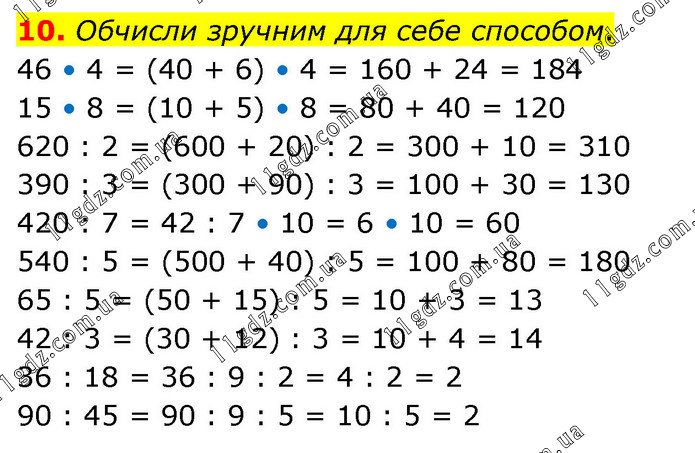 Обчисли зручним для себе способом. 46 • 4 = (40 + 6) • 4 = 160 + 24 = 184 15 • 8 = (10 + 5) • 8 = 80 + 40 = 120 620 : 2 = (600 + 20) : 2 = 300 + 10 = 310 390 : 3 = (300 + 90) : 3 = 100 + 30 = 130 420 : 7 = 42 : 7 • 10 = 6 • 10 = 60 540 : 5 = (500 + 40) : 5 = 100 + 80 = 180 65 : 5 = (50 + 15) : 5 = 10 + 3 = 13 42 : 3 = (30 + 12) : 3 = 10 + 4 = 14 36 : 18 = 36 : 9 : 2 = 4 : 2 = 2 90 : 45 = 90 : 9 : 5 = 10 : 5 = 2