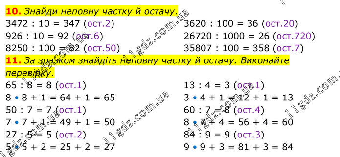 Знайди неповну частку й остачу. 3472 : 10 = 347 (ост.2) 926 : 10 = 92 (ост.6) 8250 : 100 = 82 (ост.50) 3620 : 100 = 36 (ост.20) 26720 : 1000 = 26 (ост.720) 35807 : 100 = 358 (ост.7) 11. За зразком знайдіть неповну частку й остачу. Виконайте перевірку. 65 : 8 = 8 (ост.1) 8 • 8 + 1 = 64 + 1 = 65 50 : 7 = 7 (ост.1) 7 • 7 + 1 = 49 + 1 = 50 27 : 5 = 5 (ост.2) 5 • 5 + 2 = 25 + 2 = 27 13 : 4 = 3 (ост.1) 3 • 4 + 1 = 12 + 1 = 13 60 : 7 = 8 (ост.4) 8 • 7 + 4 = 56 + 4 = 60 84 : 9 = 9 (ост.3) 9 • 9 + 3 = 81 + 3 = 84