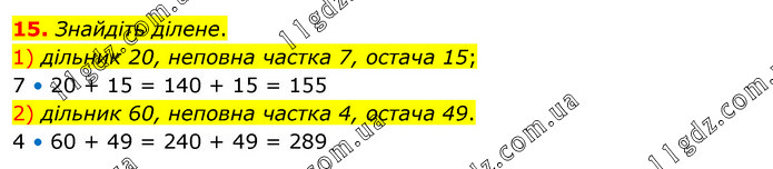 Знайдіть ділене. 1) дільник 20, неповна частка 7, остача 15; 7 • 20 + 15 = 140 + 15 = 155 2) дільник 60, неповна частка 4, остача 49. 4 • 60 + 49 = 240 + 49 = 289