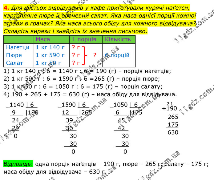 Для шістьох відвідувачів у кафе приготували курячі наґетси, картопляне пюре й овочевий салат. Яка маса однієї порції кожної страви в грамах? Яка маса всього обіду для кожного відвідувача? Складіть вирази і знайдіть їх значення письмово. 1) 1 кг 140 г : 6 = 1140 г : 6 = 190 (г) – порція наґетців; 2) 1 кг 590 г : 6 = 1590 г : 6 =265 (г) – порція пюре; 3) 1 кг 50 г : 6 = 1050 г : 6 = 175 (г) – порція салату; 4) 190 + 265 + 175 = 630 (г) – маса обіду для відвідувача. Відповідь: одна порція наґетців – 190 г, пюре – 265 г, салату – 175 г; маса обіду для відвідувача – 630 г.