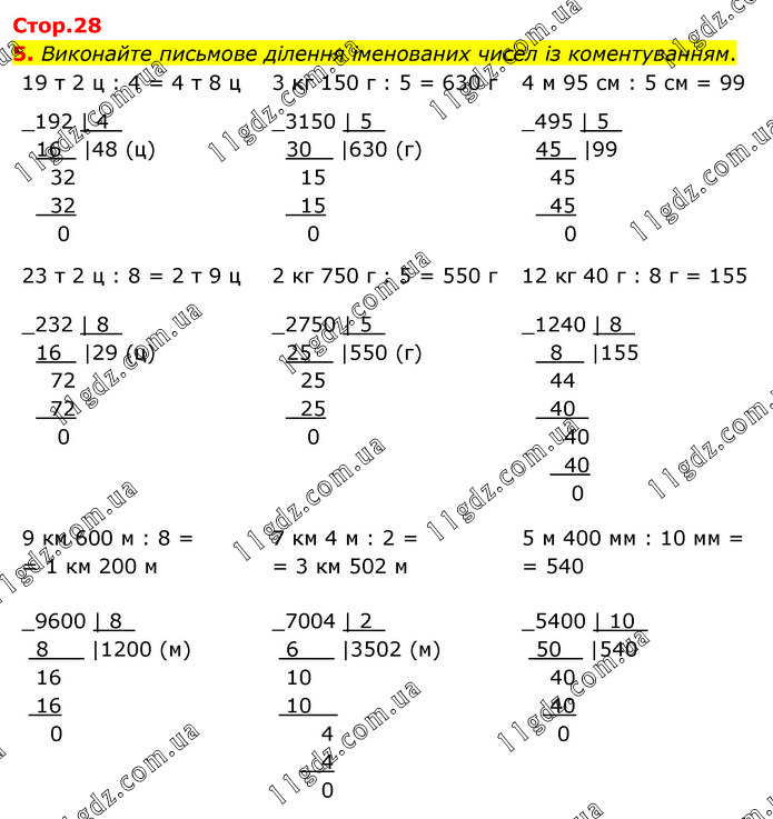 Виконайте письмове ділення іменованих чисел із коментуванням. 19 т 2 ц : 4 = 4 т 8 ц 3 кг 150 г : 5 = 630 г 4 м 95 см : 5 см = 99 23 т 2 ц : 8 = 2 т 9 ц 2 кг 750 г : 5 = 550 г 12 кг 40 г : 8 г = 155 9 км 600 м : 8 = 1 км 200 м 7 км 4 м : 2 = 3 км 502 м 5 м 400 мм : 10 мм = 540
