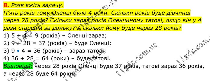 Розв'яжіть задачу. П’ять років тому Оленці було 4 роки. Скільки років буде дівчинці через 28 років? Скільки зараз років Оленчиному татові, якщо він у 4 рази старший за доньку? А скільки йому буде через 28 років? 1) 5 + 4 = 9 (років) – Оленці зараз; 2) 9 + 28 = 37 (років) – буде Оленці; 3) 9 • 4 = 36 (років) – зараз татові; 4) 36 + 28 = 64 (роки) – буде татові. Відповідь: через 28 років Оленці буде 37 років, татові зараз 36 років, а через 28 буде 64 роки.