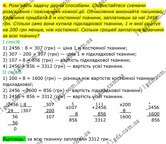 Розв'яжіть задачу двома способами. Скористайтеся схемами розв'язання і поясненням кожної дії. Обчислення виконайте письмово. Кравчиня придбала 8 м костюмної тканини, заплативши за неї 2456 грн. Стільки само вона купила підкладкової тканини, 1 м якої коштує на 200 грн менше, ніж костюмної. Скільки грошей заплатила кравчиня за всю тканину? I спосіб 1) 2456 : 8 = 307 (грн) — ціна 1 м костюмної тканини; 2) 307 – 200 = 107 (грн) — ціна 1 м підкладкової тканини; 3) 107 • 8 = 856 (грн) — вартість підкладкової тканини; 4) 2456 + 856 = 3312 (грн) — вартість усієї тканини. II спосіб 1) 200 • 8 = 1600 (грн) — різниця між вартістю костюмної тканини і підкладкової; 2) 2456 – 1600 = 856 (грн) — вартість підкладкової тканини; 3) 2456 + 856 = 3312 (грн) — вартість усієї тканини. Відповідь: за всю тканину заплатили 3312 грн.