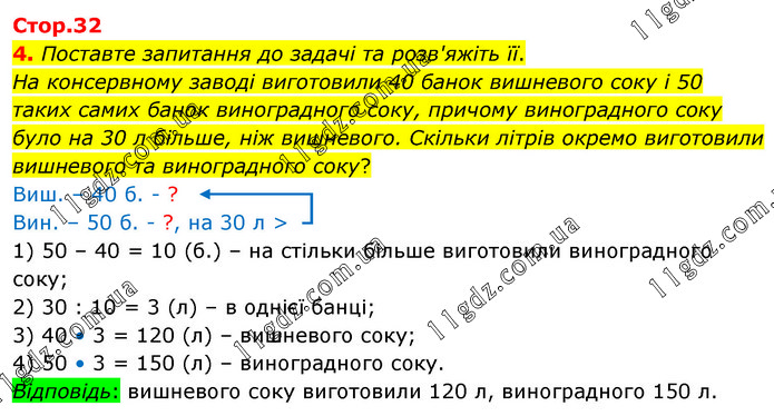 Поставте запитання до задачі та розв'яжіть її. На консервному заводі виготовили 40 банок вишневого соку і 50 таких самих банок виноградного соку, причому виноградного соку було на 30 л більше, ніж вишневого. Скільки літрів окремо виготовили вишневого та виноградного соку? 1) 50 – 40 = 10 (б.) – на стільки більше виготовили виноградного соку; 2) 30 : 10 = 3 (л) – в однієї банці; 3) 40 • 3 = 120 (л) – вишневого соку; 4) 50 • 3 = 150 (л) – виноградного соку. Відповідь: вишневого соку виготовили 120 л, виноградного 150 л.