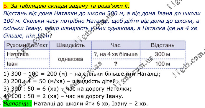 За таблицею склади задачу та розв'яжи її. Відстань від дома Наталки до школи 300 м, а від дома Івана до школи 100 м. Скільки часу потрібно Наталці, щоб дійти від дома до школи, а скільки Івану, якщо швидкість у них однакова, а Наталка іде на 4 хв більше, ніж Іван? 1) 300 – 100 = 200 (м) – на стільки більше йти Наталці; 2) 200 : 4 = 50 (м/хв) – швидкість дітей; 3) 300 : 50 = 6 (хв) – час на дорогу Наталки; 4) 100 : 50 = 2 (хв) – час на дорогу Івану. Відповідь: Наталці до школи йти 6 хв, Івану – 2 хв.