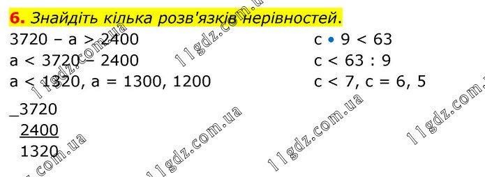 Знайдіть кілька розв'язків нерівностей. 3720 – а > 2400 a < 3720 – 2400 a < 1320, a = 1300, 1200 c • 9 < 63 c < 63 : 9 c < 7, c = 6, 5