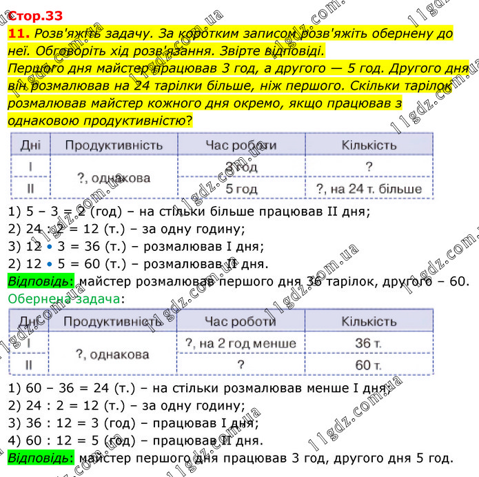Розв'яжіть задачу. За коротким записом розв'яжіть обернену до неї. Обговоріть хід розв'язання. Звірте відповіді. Першого дня майстер працював 3 год, а другого — 5 год. Другого дня він розмалював на 24 тарілки більше, ніж першого. Скільки тарілок розмалював майстер кожного дня окремо, якщо працював з однаковою продуктивністю? 1) 5 – 3 = 2 (год) – на стільки більше працював ІІ дня; 2) 24 : 2 = 12 (т.) – за одну годину; 3) 12 • 3 = 36 (т.) – розмалював І дня; 2) 12 • 5 = 60 (т.) – розмалював ІІ дня. Відповідь: майстер розмалював першого дня 36 тарілок, другого – 60. Обернена задача: 1) 60 – 36 = 24 (т.) – на стільки розмалював менше І дня; 2) 24 : 2 = 12 (т.) – за одну годину; 3) 36 : 12 = 3 (год) – працював І дня; 4) 60 : 12 = 5 (год) – працював ІІ дня. Відповідь: майстер першого дня працював 3 год, другого дня 5 год.