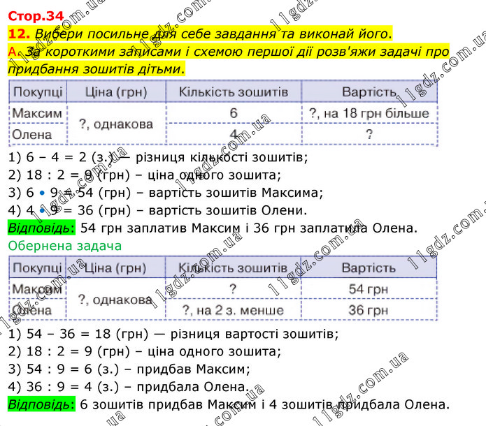 Вибери посильне для себе завдання та виконай його. А. За короткими записами і схемою першої дії розв'яжи задачі про придбання зошитів дітьми. 1) 6 – 4 = 2 (з.) — різниця кількості зошитів; 2) 18 : 2 = 9 (грн) – ціна одного зошита; 3) 6 • 9 = 54 (грн) – вартість зошитів Максима; 4) 4 • 9 = 36 (грн) – вартість зошитів Олени. Відповідь: 54 грн заплатив Максим і 36 грн заплатила Олена. Обернена задача 1) 54 – 36 = 18 (грн) — різниця вартості зошитів; 2) 18 : 2 = 9 (грн) – ціна одного зошита; 3) 54 : 9 = 6 (з.) – придбав Максим; 4) 36 : 9 = 4 (з.) – придбала Олена. Відповідь: 6 зошитів придбав Максим і 4 зошитів придбала Олена.