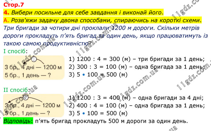 Вибери посильне для себе завдання і виконай його. А. Розв'яжи задачу двома способами, спираючись на короткі схеми. Три бригади за чотири дні проклали 1200 м дороги. Скільки метрів дороги прокладуть п’ять бригад за один день, якщо працюватимуть із такою самою продуктивністю? І спосіб: 1) 1200 : 4 = 300 (м) – три бригади за 1 день; 2) 300 : 3 = 100 (м) – одна бригада за 1 день; 3) 5 • 100 = 500 (м) ІІ спосіб: 1) 1200 : 3 = 400 (м) – одна бригади за 4 дні; 2) 400 : 4 = 100 (м) – одна бригада за 1 день; 3) 5 • 100 = 500 (м) Відповідь: п’ять бригад прокладуть 500 м дороги за один день.