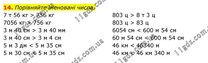 Порівняйте іменовані числа. 7 т 56 кг > 756 кг 7056 кг > 756 кг 3 м 40 см > 3 м 40 мм 3 м 40 см > 3 м 4 см 5 м 3 дм < 5 м 35 см 5 м 30 см < 5 м 35 см 803 ц > 8 т 3 ц 803 ц > 83 ц 6054 см < 600 м 54 см 60 м 54 см < 600 м 54 см 46 км < 46340 м 46 км < 46 км 340 м