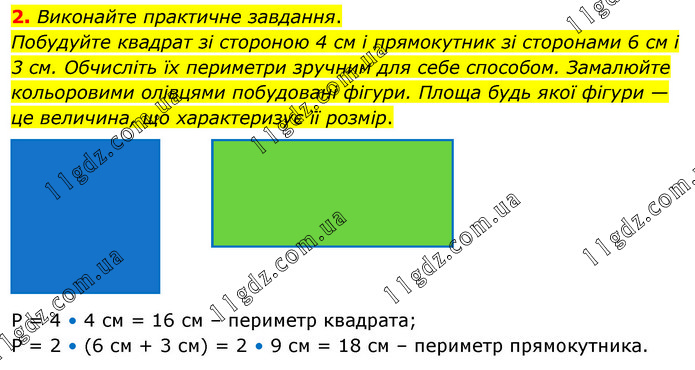 Виконайте практичне завдання. Побудуйте квадрат зі стороною 4 см і прямокутник зі сторонами 6 см і 3 см. Обчисліть їх периметри зручним для себе способом. Замалюйте кольоровими олівцями побудовані фігури. Площа будь якої фігури — це величина, що характеризує її розмір. Р = 4 • 4 см = 16 см – периметр квадрата; Р = 2 • (6 см + 3 см) = 2 • 9 см = 18 см – периметр прямокутника.