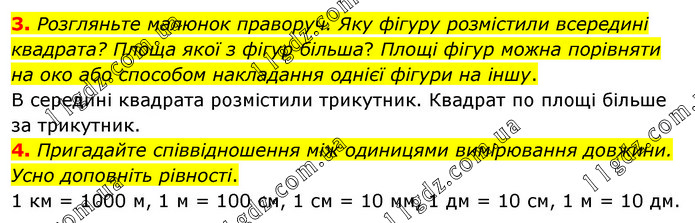 Розгляньте малюнок праворуч. Яку фігуру розмістили всередині квадрата? Площа якої з фігур більша? Площі фігур можна порівняти на око або способом накладання однієї фігури на іншу. В середині квадрата розмістили трикутник. Квадрат по площі більше за трикутник. 4. Пригадайте співвідношення між одиницями вимірювання довжини. Усно доповніть рівності. 1 км = 1000 м, 1 м = 100 см, 1 см = 10 мм, 1 дм = 10 см, 1 м = 10 дм.