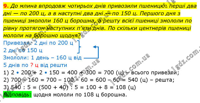 До млина впродовж чотирьох днів привозили пшеницю: перші два дні — по 200 ц, а в наступні два дні — по 150 ц. Першого дня з пшениці змололи 160 ц борошна, а решту всієї пшениці змололи по рівну протягом наступних п’яти днів. По скільки центнерів пшениці мололи на борошно щодня? Привезли: 2 дні по 200 ц 2 дні по 150 ц Змололи: 1 день – 160 ц від 5 днів по ? ц від решти 1) 2 • 200 + 2 • 150 = 400 + 300 = 700 (ц) – всього привезли; 2) 700 – 160 = 700 – 100 – 60 = 600 – 60 = 540 (ц) – решта; 3) 540 : 5 = (500 + 40) : 5 = 100 + 8 = 108 (ц) Відповідь: щодня мололи по 108 ц борошна.