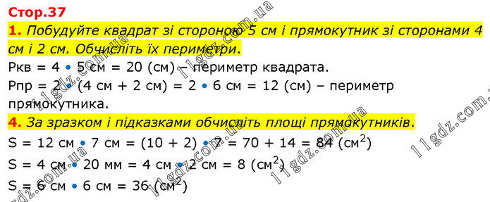 1. Побудуйте квадрат зі стороною 5 см і прямокутник зі сторонами 4 см і 2 см. Обчисліть їх периметри. Ркв = 4 • 5 см = 20 (см) – периметр квадрата. Рпр = 2 • (4 см + 2 см) = 2 • 6 см = 12 (см) – периметр прямокутника. 4. За зразком і підказками обчисліть площі прямокутників. S = 12 см • 7 см = (10 + 2) • 7 = 70 + 14 = 84 (см2) S = 4 см • 20 мм = 4 см • 2 см = 8 (см2) S = 6 см • 6 см = 36 (см2)